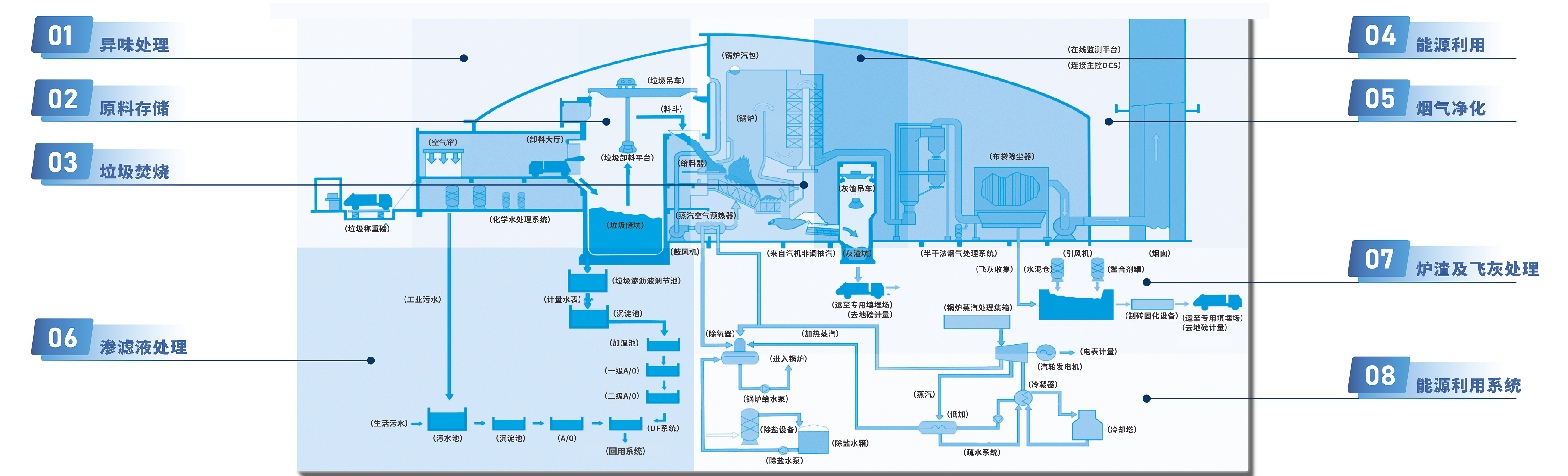 bv1946伟德生活垃圾焚烧发电处理模式将全流程划分为八大模块,构建囊括垃圾入库、储存、焚烧,烟气净化、渗滤液处理、炉渣及飞灰处理、热能产生、能源利用的八大系统。